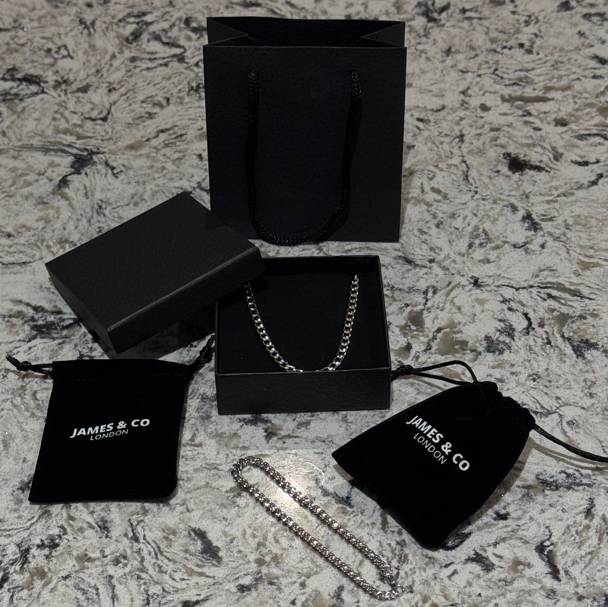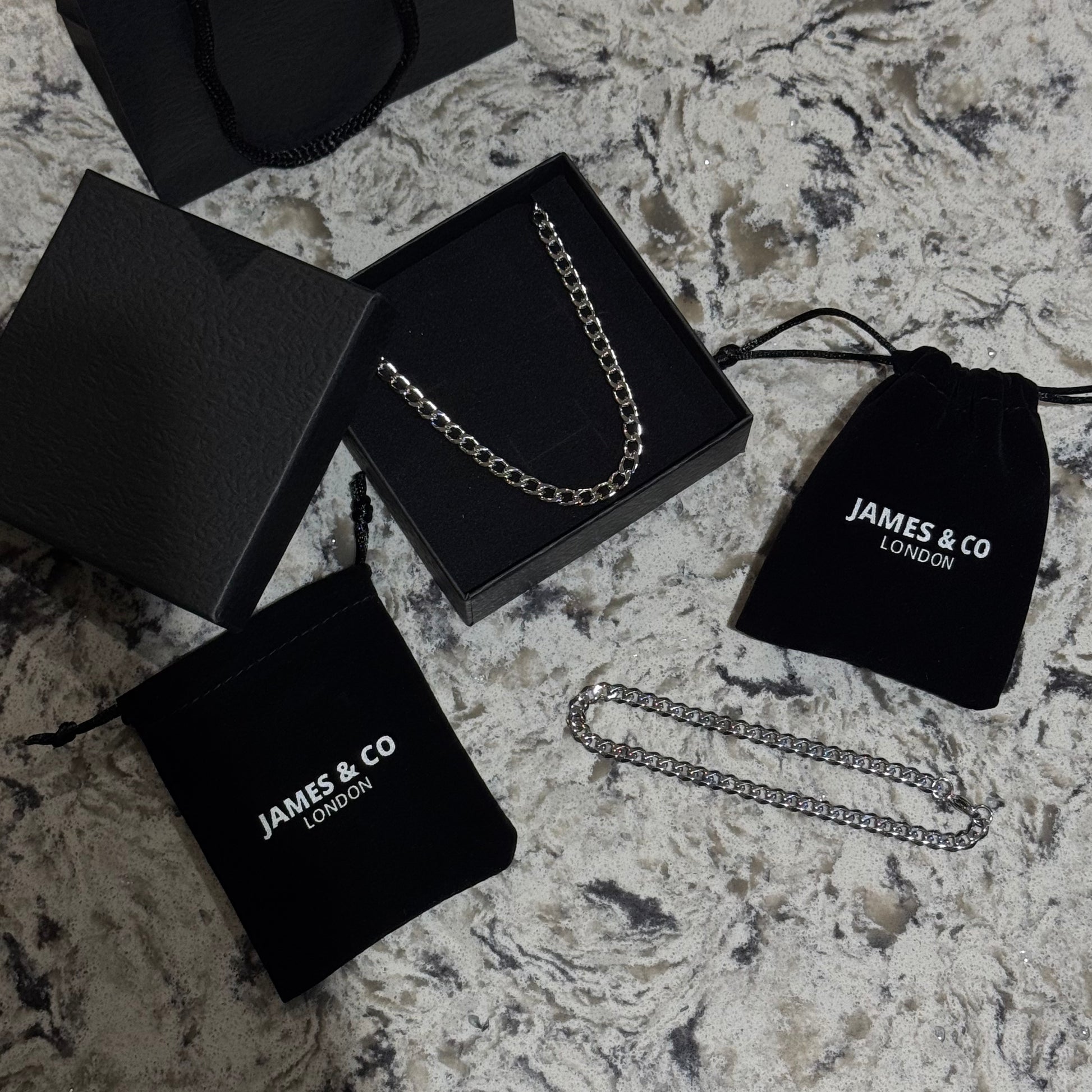 This 5mm silver Cuban Chain & Bracelet Gift Set is crafted for those who appreciate bold simplicity and everyday style. Presented in a premium James & Co London pouch, with an optional gift box and bag, it’s the perfect present for birthdays, celebrations, or just because. Whether it’s a gift for him or yourself, this matching set offers a sleek, polished look that elevates any outfit.