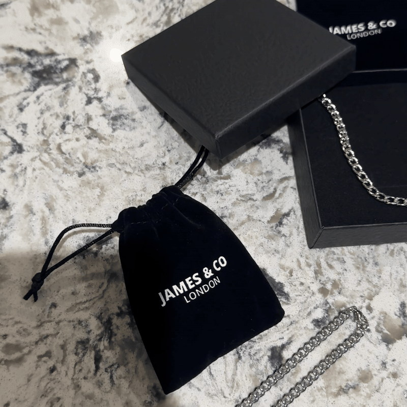 This 5mm silver Cuban Chain & Bracelet Gift Set is crafted for those who appreciate bold simplicity and everyday style. Presented in a premium James & Co London pouch, with an optional gift box and bag, it’s the perfect present for birthdays, celebrations, or just because. Whether it’s a gift for him or yourself, this matching set offers a sleek, polished look that elevates any outfit.